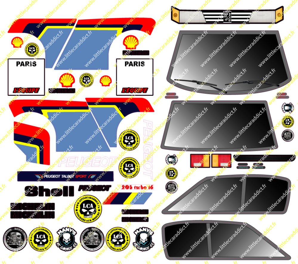 Apportez une finition réaliste à votre  Peugeot 205 RALLY ElsasBody  avec cette planche de stickers pour vitres et feux spécialement conçue pour les carrosseries incassables. Imprimée en haute définition sur un vinyle adhésif de qualité premium, elle assure des couleurs éclatantes, une excellente tenue et une pose facile. Les stickers reproduisent fidèlement les vitrages, phares et feux arrière, ajoutant du réalisme à votre modèle. Idéale pour les passionnés de modélisme cherchant à personnaliser leur 205 avec des détails précis et authentiques. Chaque élément est soigneusement dimensionné pour s’adapter parfaitement à la carrosserie ElsasBody. Une solution efficace pour une finition propre et professionnelle, avec un rendu esthétique optimal. Qualité, précision et réalisme garantis !