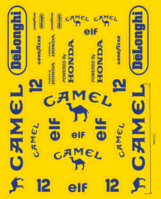 Rendez hommage à la légendaire Lotus 99T de Formule 1 avec notre planche d’autocollants Camel dédiée. Notre expertise technique garantit la reproduction la plus fidèle des sponsors et logos de cette monoplace emblématique.